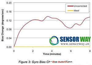 圖7:隨時間改變的陀螺儀零偏,包括校正和未校正的情況。